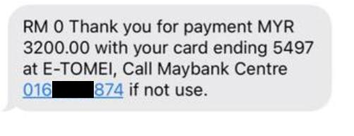 RM0谢谢您使用以5497结尾的卡在ETOMEI进行了MYR3200.00的支付。如果您未使用,请致电Maybank中心016xxxx874。