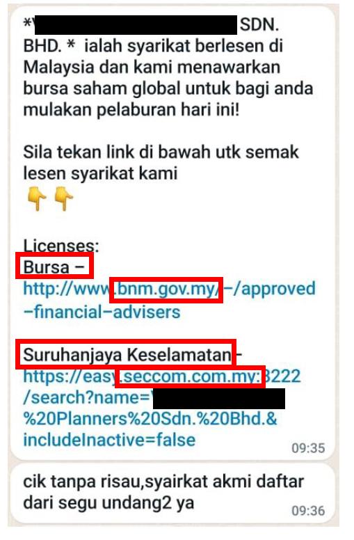 - 只凭链接无法证明什么,因为这些信息都可以轻松在网上搜索得到。在进行投资之前,应该确认建议你投资的人是否持有执照。若存有疑问,先致电给公司核实该人的身分和投资计划。