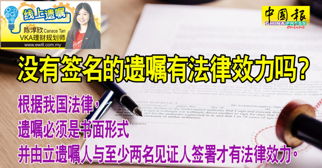随着电子商务模式兴起和新冠疫情突然来袭,市面上越来越多在线上设立遗嘱或是DIY (Do it yourself)遗嘱服务,以应对市场需求。虽说在线上立遗嘱非常快捷方便,但是还有一个需要特别强调的部分,是遗嘱一定要由立遗嘱人与两名见证人签署后,才具有法律效力。