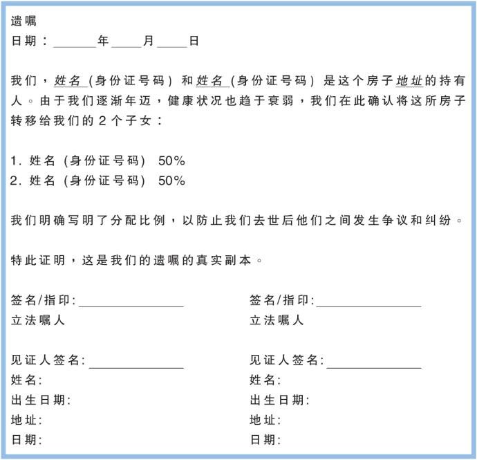 - 夫妻双方准备的是同一份遗嘱。在外国,夫妻共同写一份遗嘱也许是很普遍的,然而,在马来西亚,即使是已婚夫妇,也需要分别写两份独立的遗嘱。